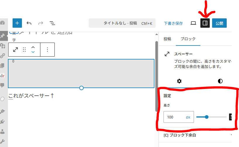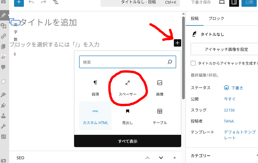 ブログ投稿の編集画面で、ブロック選択「+」→「スペーサー」を選びます。
