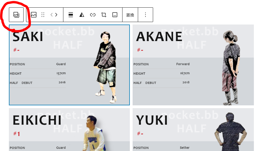 ギャラリーの表示列数を変更したい場合は、左上のアイコンをクリックすると右側にメニューが表示されますので、その中の「カラム」で調整します。