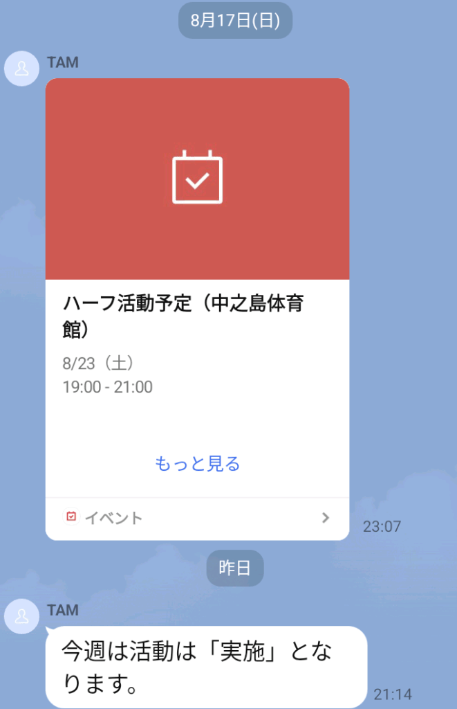活動がある週の水曜17時の時点での参加予定人数を見て、活動か中止かの判断をして案内します。