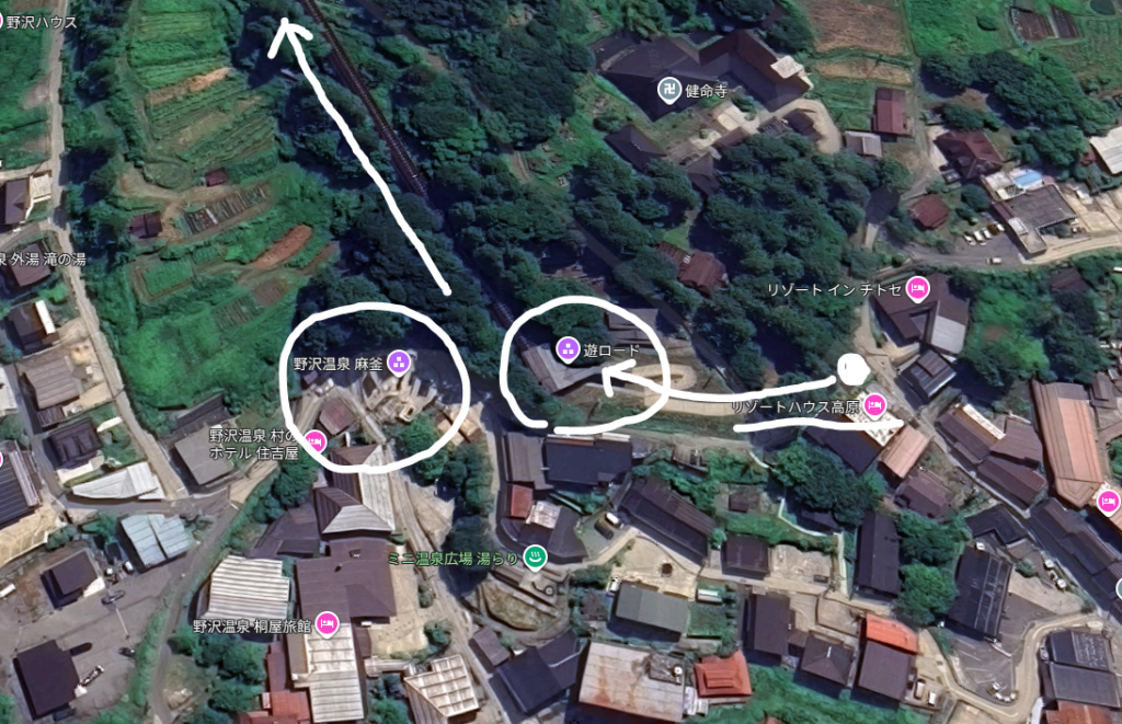 無料で利用できる「横落駐車場」(Googleマップ)に車を止め、いざ温泉街へ。