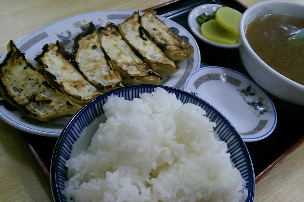 焼き餃子500円に白飯200円を注文すると、スープとお新香がついた餃子定食にしてくれます。