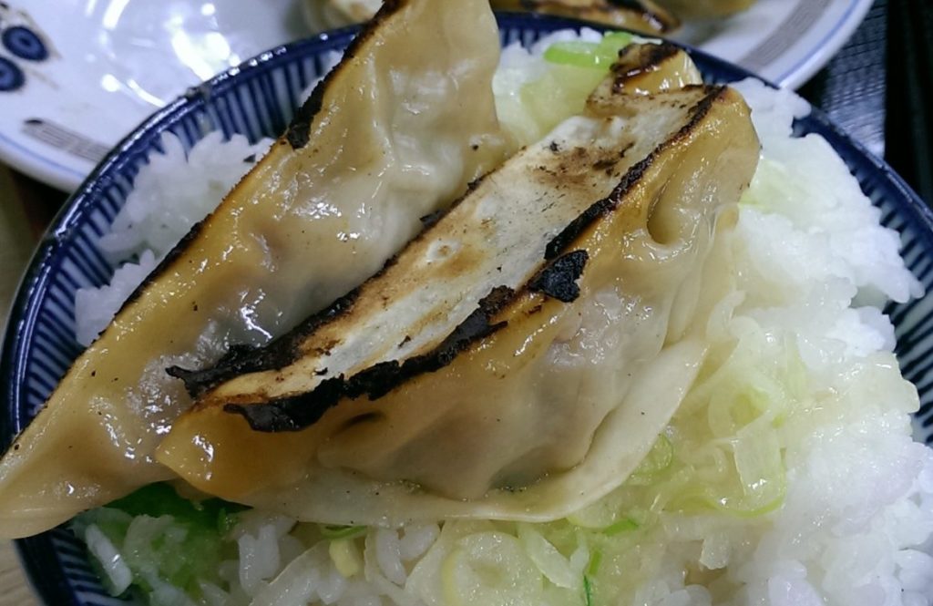 お気に入りは卓上のネギをスープにつけといてから、ネギと餃子をライスに乗せていただく餃子丼スタイル。