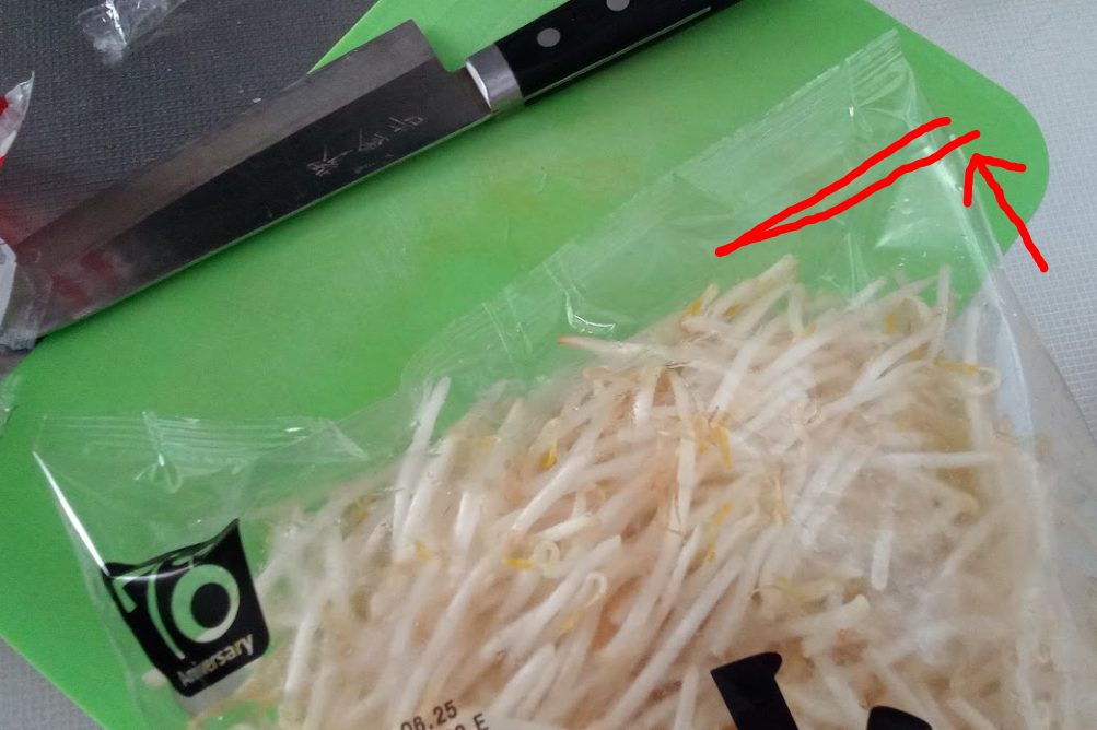 ちなみに、1袋200gのもやしは、袋の上部に切り込みを入れ、600Wで3分だけ。