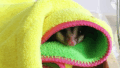 ママが準備していた「三角ハウス」は大きすぎて中に入らなかったため、ペットショップからいただいた唐草模様の渋い袋をそのまま使用。