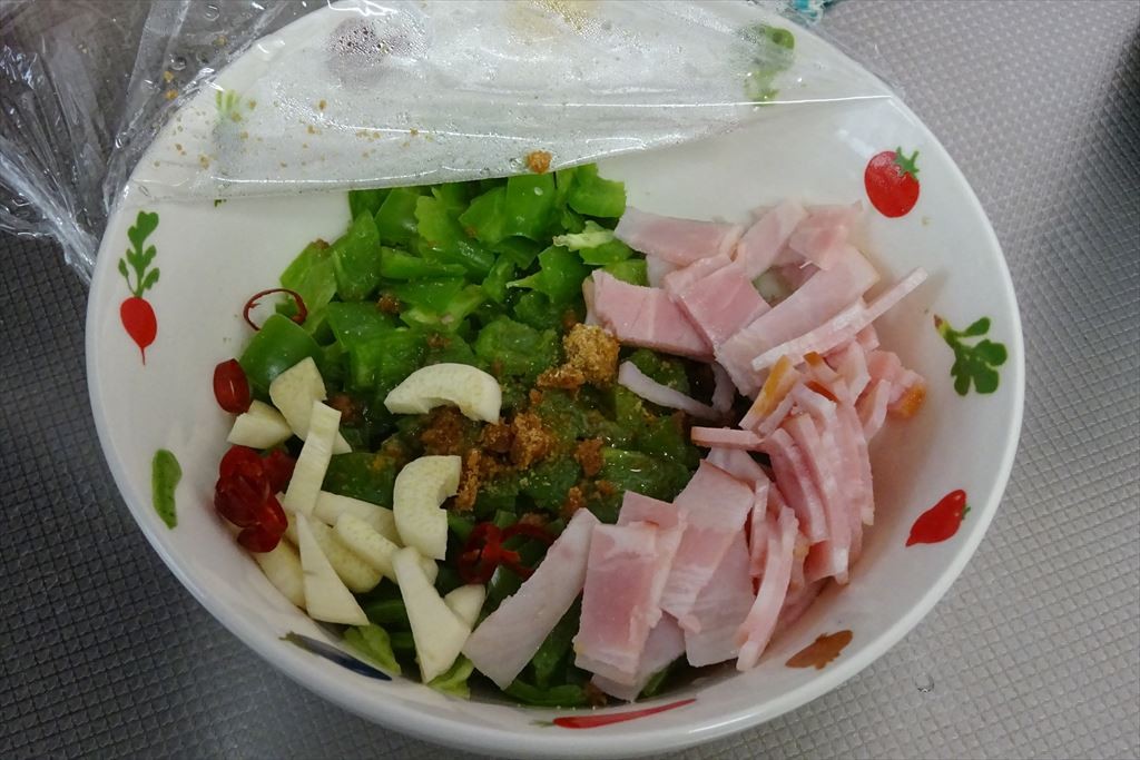 まずはピーマンの種をとって、お好みの大きさにザクザク切っていきます。