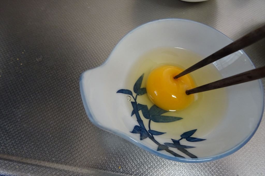 黄身を箸でプスっと刺し、かぶるまで水を入れてから600Wで1分。