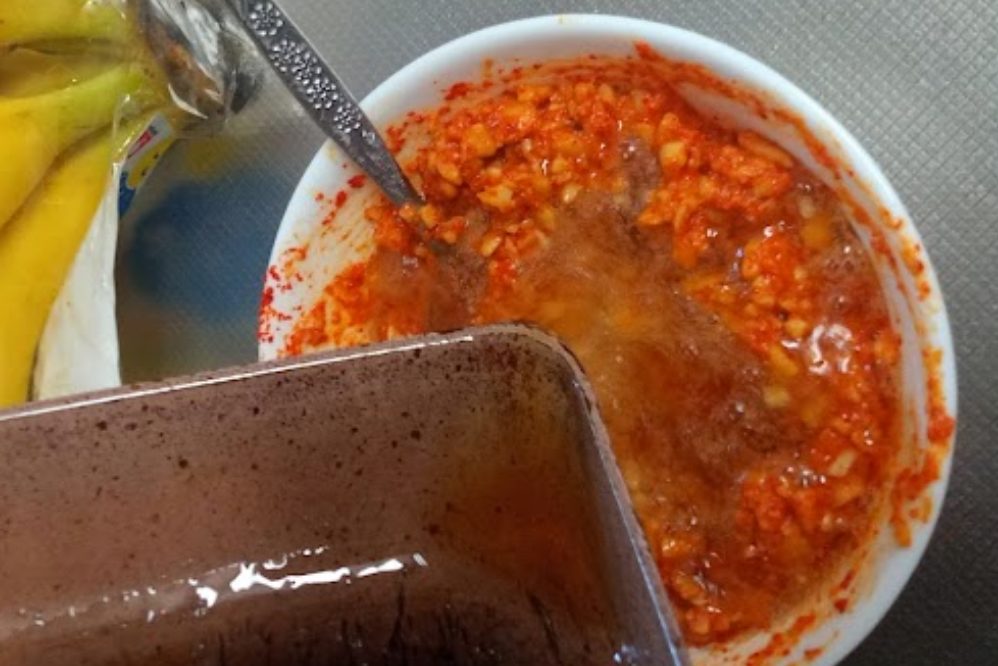③ サラダ油とごま油をフライパンで熱し、ピーナッツと味噌を混ぜ込んだお皿に注ぎ入れる