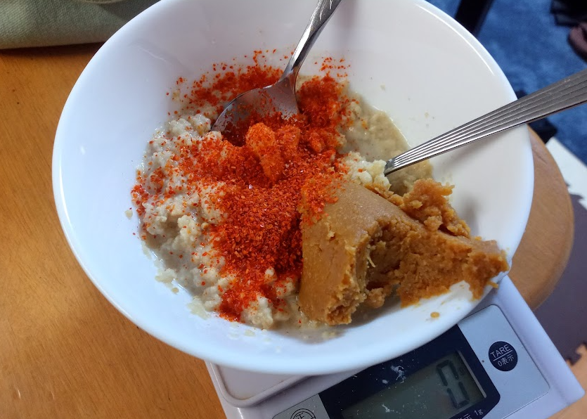 ② 水を入れてふやかし、味噌、唐辛子、にんにくも入れてよく混ぜる