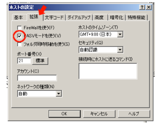 『PASVモードを使う』にチェックを入れる。
